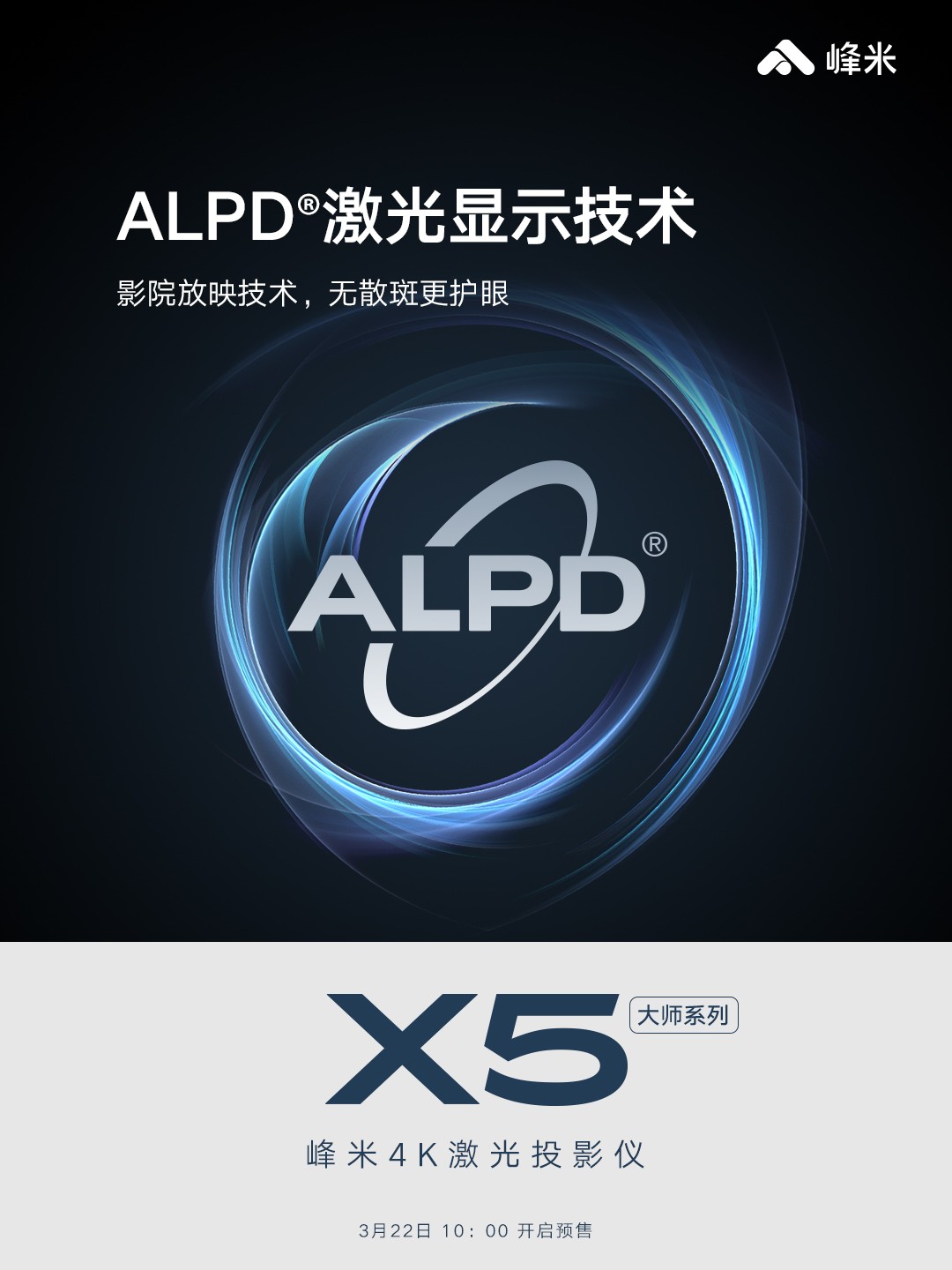 3月22日上午10点,“激光智能投影开创者”峰米投影大师系列新品峰米X5 4K激光投影仪(下称“峰米X5”)正式上市,在天猫、京东、小米有品、抖音、峰米线下零售店等多家渠道开启预售。峰米X5采用全新的CVIA亮度标准,凭借影院高端激光厅同源ALPD激光显示技术、千吋也超亮的2450 CVIA流明亮度、超越电视亮度表现、与世界级豪华音响品牌天龙合作调音的音响等众多优秀配置功能,再度领跑激光智能投影这条创新赛道,助力家用智能投影行业迈入4K激光超亮时代。