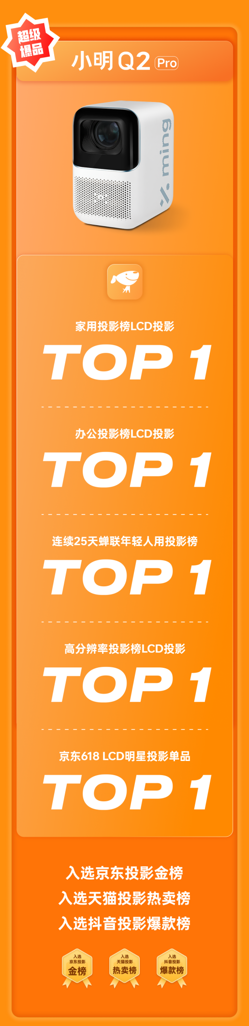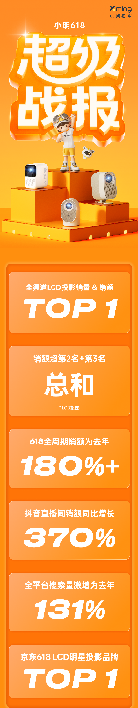 LCD投影标准制定者和LCD投影行业的领导品牌小明投影(以下简称“小明”)正式发布2023年618超级战报,斩获LCD投影全渠道销额与销量TOP1,销售额超第二名与第三名总和,618全周期销售额更是去年同期的180%+,抖音直播间销额同比增长370%,并当选京东618LCD明星投影品牌TOP1。